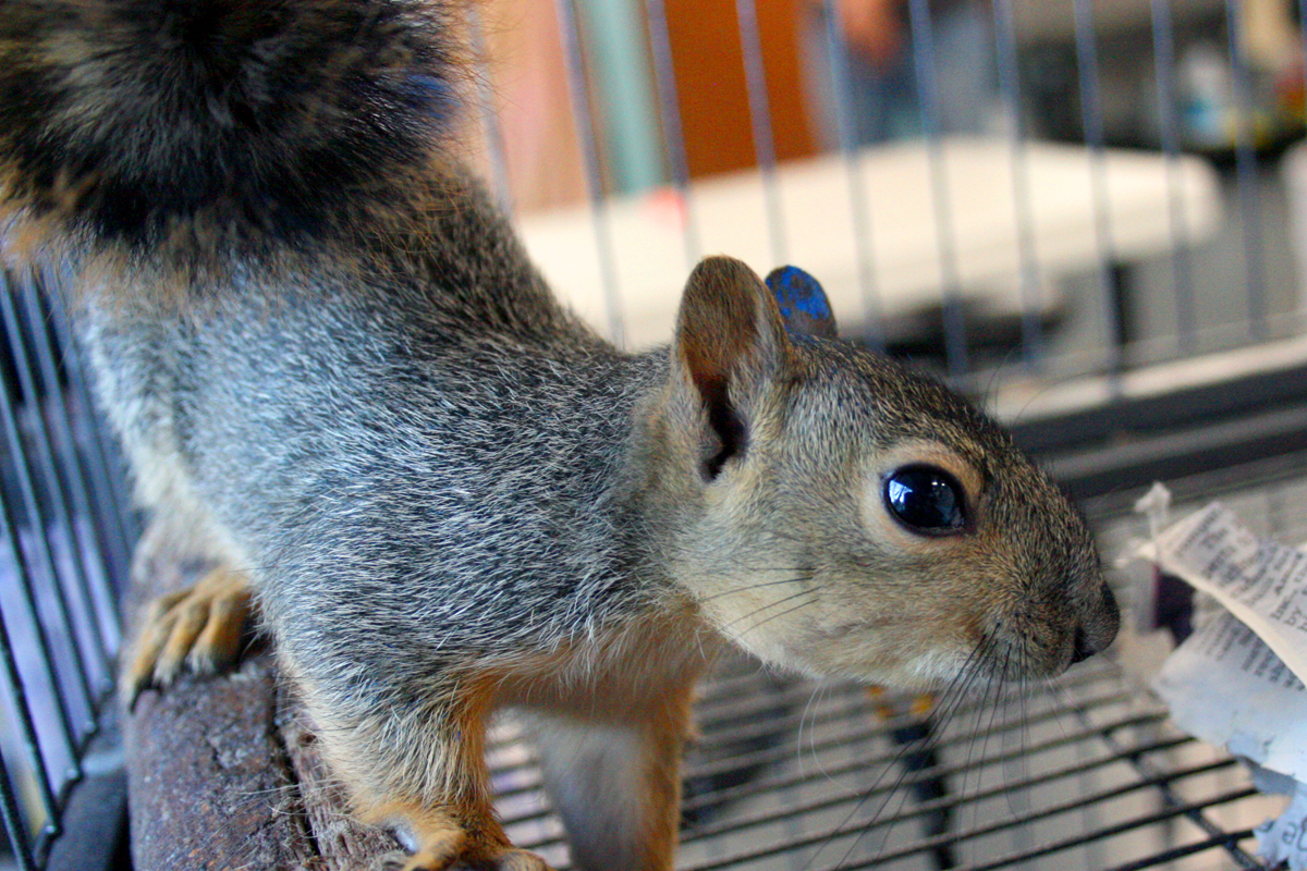 Peering in through the small opening of one enclosure, I could see only a jumble of ears, paws and noses protruding from a dense furred pile, each coyote looking away from me as if thinking, “if I can’t see you, you can’t see me.” With my Kevlar gloves on and a towel under my arm, I squatted down and began to crawl in, slowly and quietly, one small step at a time. I knew that if I could cover their faces, they would calm and I would be able to work with them more easily. While one coyote leaped repeatedly at a corner of the enclosure, another squeezed past me through the small enclosure door. I managed to cover two of the remaining coyotes with towels, keeping them quieted while Dr. Tom gathered the one that managed to sneak through, and then I wrestled with the coyote leaping at the enclosure corner. Once all were covered and stilled, moving them the several feet from the enclosure into their kennels was a whole other task. It seemed simple enough, but coyotes have an unparalleled ability to enhance normal gravitational forces, pressing themselves so hard into the ground that one would think they weighed ten times what they do. It took all of my strength to move a 26-pound coyote one foot forward at a time toward and then into the kennel. One by one, with a great deal of coordination, composure and effort, we were eventually able to get all seven coyotes into their kennels, injury-free. We drove the short distance to our release site, walked the kennels down the trail a ways, then opened the doors and watched them run off up and over the hill and out of sight.