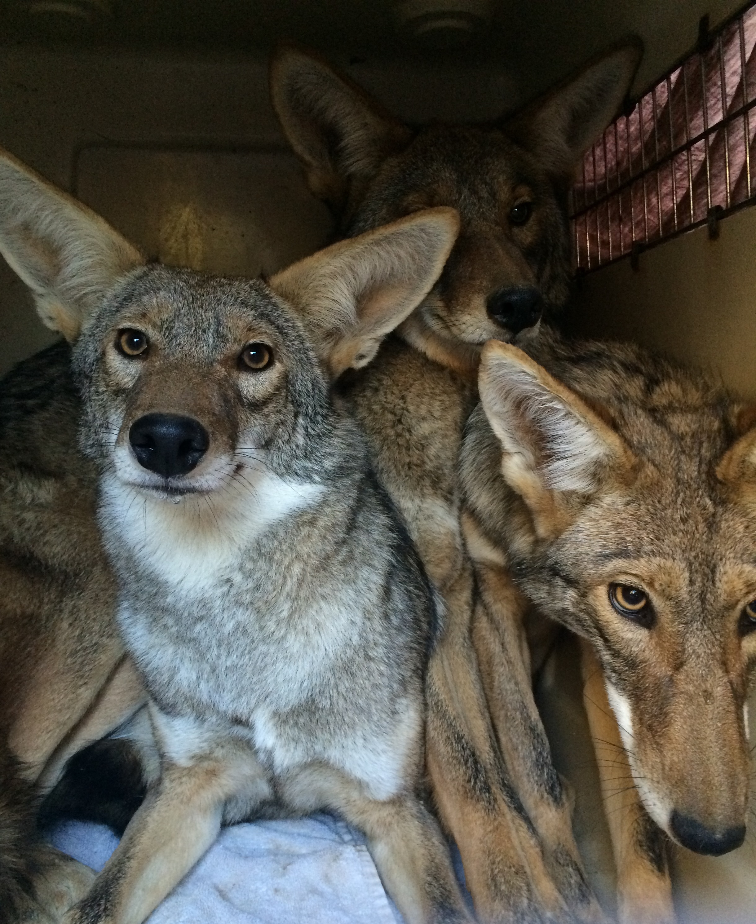 Coyotes peer out of their transport crate while on their way to their release location. Photo by Aileen Martinez